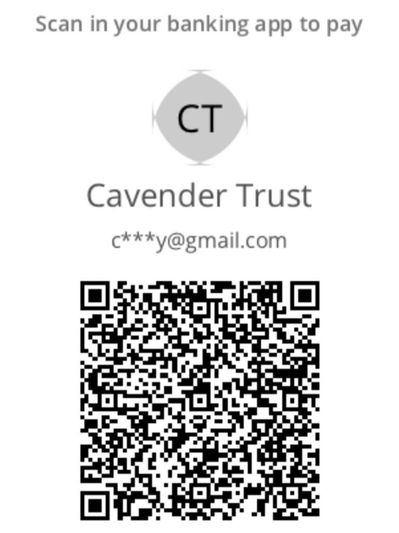 Scan the QR code in your banking app to donate directly to the Cavender trust. This helps the family receive funds without paying a processing fee.