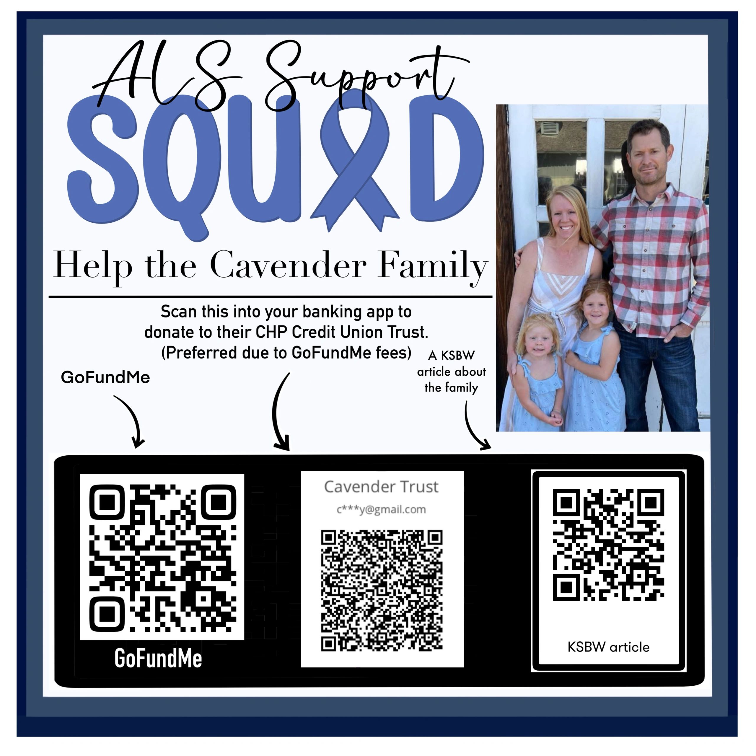 Please consider donating. The QR code below will allow you to donate via Zelle to the Cavender’s trust account through the CHP Credit Union (preferred) or the GoFundMe link below. Any donation, of any size, will help this family stay afloat.
